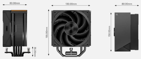 По габаритам кулер можно назвать стандартным: его высота не превышает 155 мм, ширина — 130 мм, а глубина — 80 мм.
